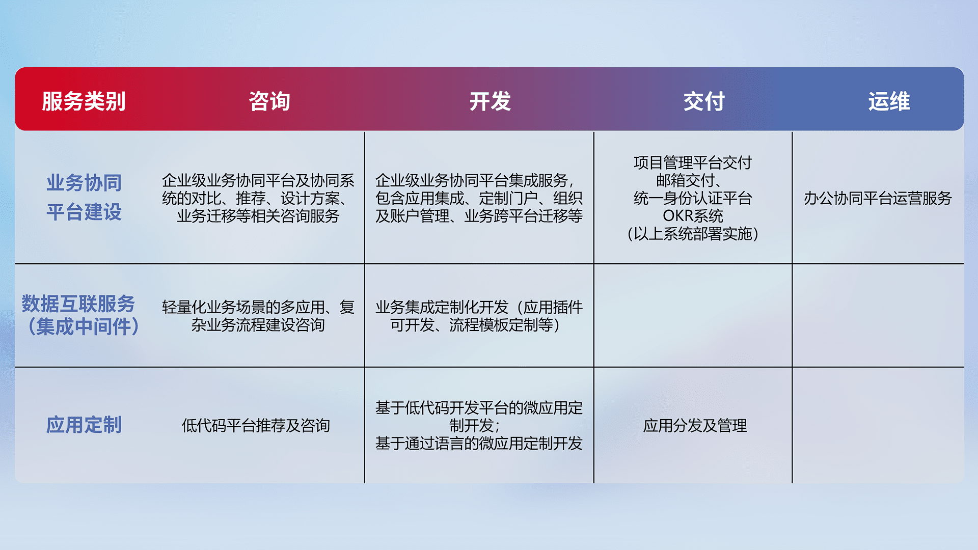 针对钉钉、、、、企微、、、、IDaas等平台级产品提供产品的规划、、、、方案、、、、交付、、定制化开发等服务,,,实现如统一协同办公、、、智能客户服务、、混合会议管理、、、智能数据查询、、等业务场景,,实现数字化转型。。